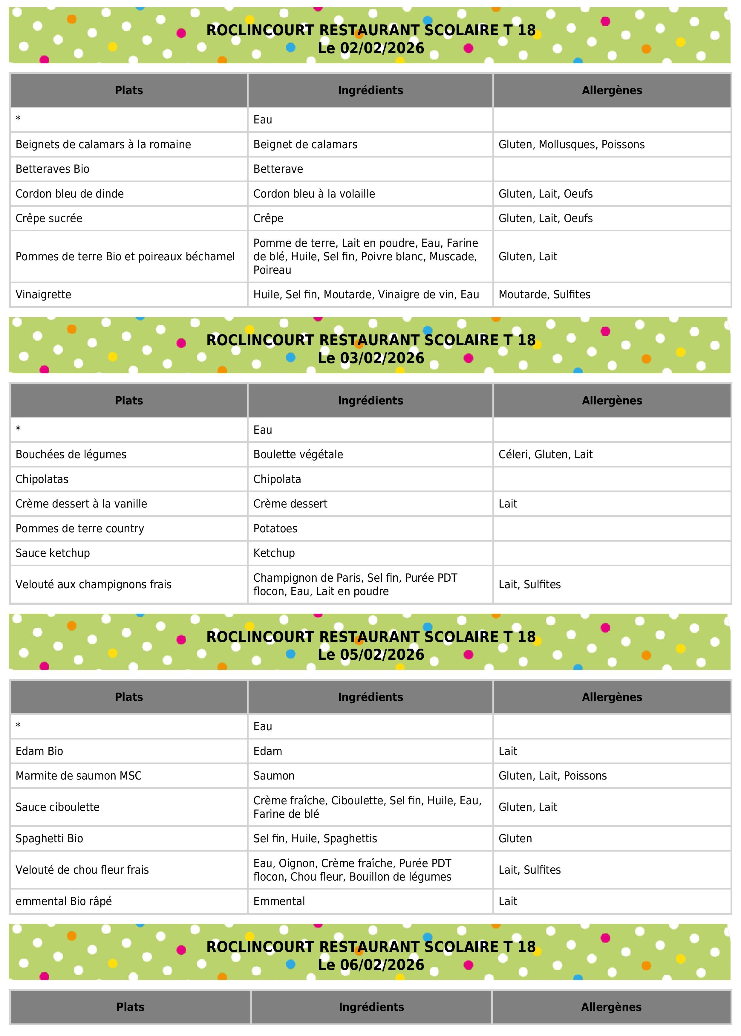 👉 Lien vers fichier PDF : Semaine 06 du 02/02/2026 au 06/02/2026👉 Lien vers fichier PDF : Semaine 06 du 02/02/2026 au 06/02/2026 (Allergènes)👉 Lien vers prestataire : API RESTAURATION |